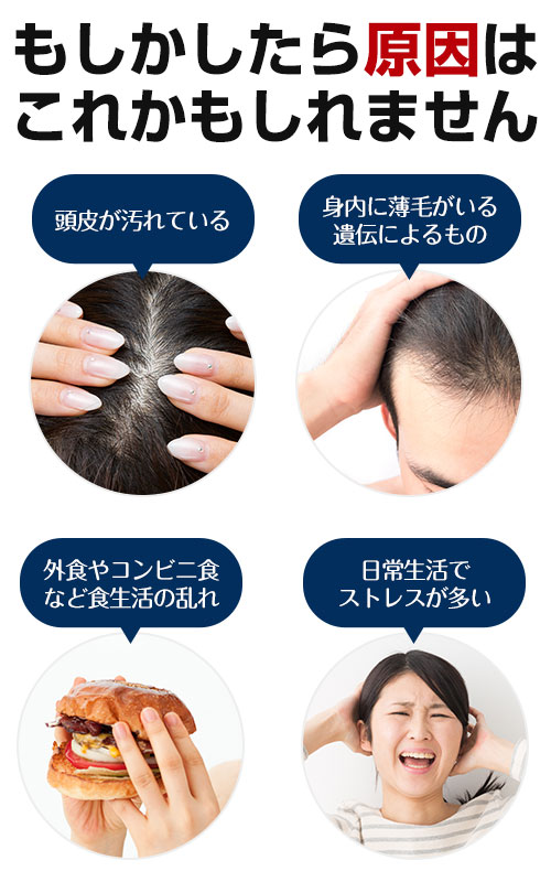 しかし、厚生省が許可している化粧品用の原料は約3000品目あります。ということは指定成分103品目以外の約2900品目については何が入っているか知らされていない事になり、頭皮に悪い成分がシャンプーに入っている可能性が高いのでもしかしたらシャンプー自体に原因があり、シャンプーそのものをしっかり流せていないことによる毛穴の詰まりも原因かもしれません。