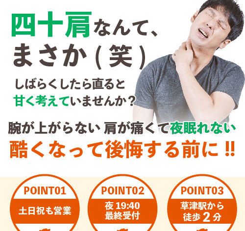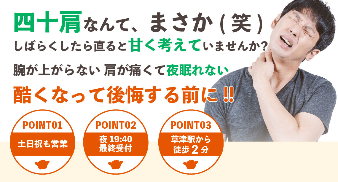 四十肩・五十肩は、湿布や痛み止めを飲んでも根本が改善できません。放っておくと、石灰化して痛みが増してきたり肩をかばって体の歪みや他の部位に痛みがでてしまいます。さらに、痛みで寝不足になりストレスがたまって仕事やプライベートに支障がでてしまう方が多いです。また、肩を動かさず安静にし続けていると、いつの間にか腕が上がらなくなってしまいます。そうなる前に滋賀県草津市にあるまいれ鍼灸整骨院・整体院 草津院・南草津院にご来院ください!